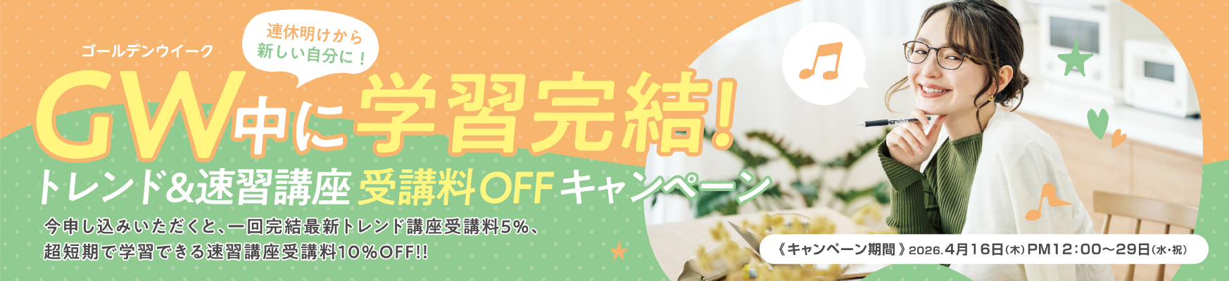 連休明けから新しい自分に!GW中に学習完結!今だけトレンド&速習講座受講料OFF