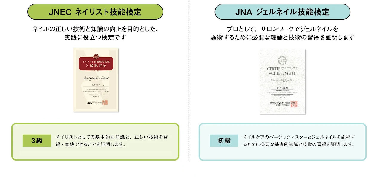 日本ネイリスト協会(JNA)」が主催する、お客様が安心して施術を受けられる健全なジェルネイルの普及を目的とした実践に役立つ検定試験です。 ジェルネイルを施術するために必要な理論と技術を持っていると判断した人を認定するものです。 |