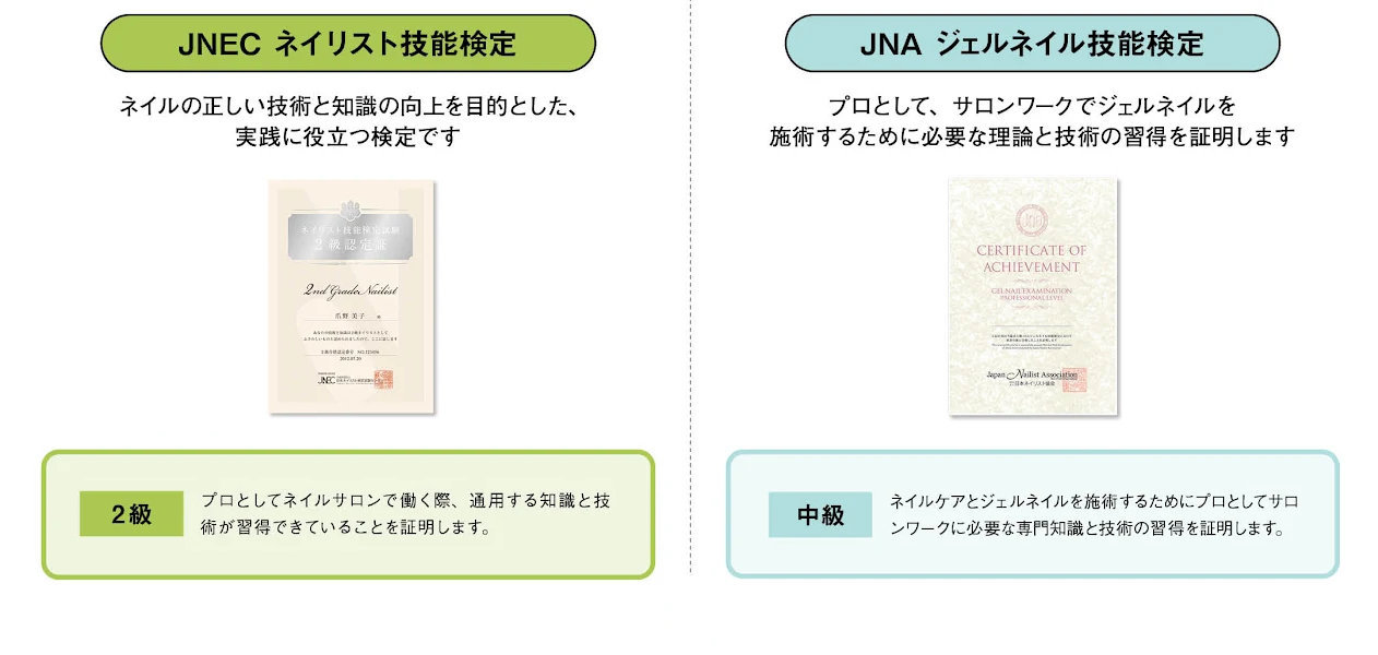 日本ネイリスト協会(JNA)」が主催する、お客様が安心して施術を受けられる健全なジェルネイルの普及を目的とした実践に役立つ検定試験です。 ジェルネイルを施術するために必要な理論と技術を持っていると判断した人を認定するものです。 |