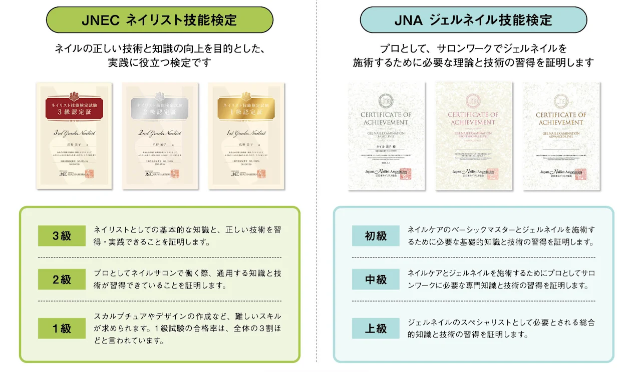 日本ネイリスト協会(JNA)」が主催する、お客様が安心して施術を受けられる健全なジェルネイルの普及を目的とした実践に役立つ検定試験です。 ジェルネイルを施術するために必要な理論と技術を持っていると判断した人を認定するものです。 |