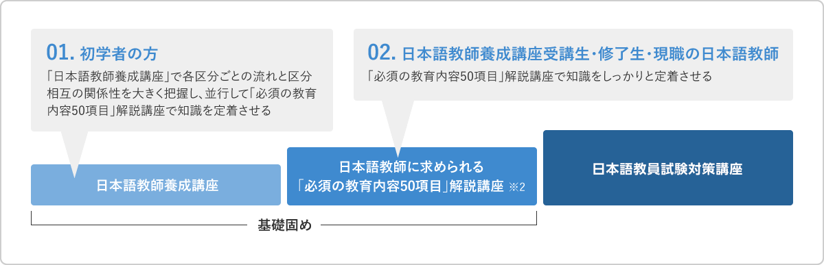 ※3 講義の編成上、「必須の教育内容50項目」を昇順、均等には扱いません。関連性のある項目をまとめ、日本語教育のために重要な項目を詳しく解説します。