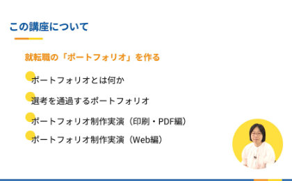 ポートフォリオ制作 Webデザイナーを中心としてWeb業界の就職活動やお仕事獲得に必須の「ポートフォリオ」について、作り方や採用されるポートフォリオのポイントをお伝えします。 また、課題として実際のご自身のポートフォリオを作成頂き、就職活動に活用することが可能になります。